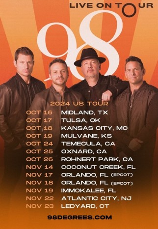 98 Degrees is back with new music, a Fall Tour, and a new record label partnership with XOXO Entertainment. The iconic boy band, consisting of Nick and Drew Lachey, Jeff Timmons, and Justin Jeffre, will open their Fall Tour on October 16th in Midland, Texas, at the Wagner Noël Performing Arts Center. Their new single, the soulful ballad “Got U,” will be available everywhere on November 15th. The group has re-recorded a selection of their classic hits, along with new music, for “Full Circle,” which will be released in January 2025 and is available for presale at https://talkshop.live/channels/98degrees.