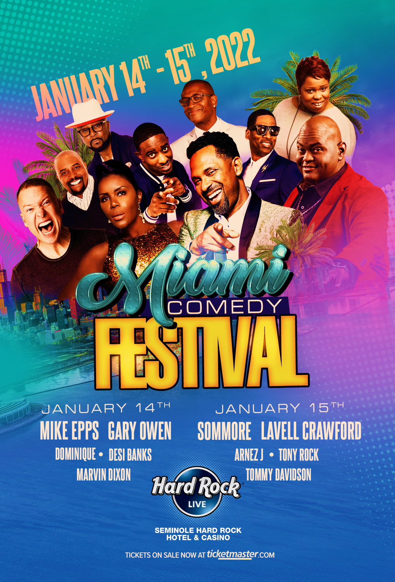The Miami Comedy Festival is set to return to South Florida once again on Jan. 14-15 at Hard Rock Live at Seminole Hard Rock Hotel & Casino in Hollywood, Fla. Throughout the years, the Miami Comedy Festival has hosted some of the biggest names in comedy and this year is no exception. The highly anticipated event will feature comedy heavyweights Mike Epps, Gary Owen, Marvin Dixon, Desi Banks, Dominique, Sommore, Arnez J, Lavell Crawford, Tony Rock, and Tommy Davidson. Tickets go on sale at 10 a.m. on Nov. 12 on Ticketmaster.com. The all-star lineup will be sure to deliver side-busting, non-stop laughter for a memorable weekend of comedy!